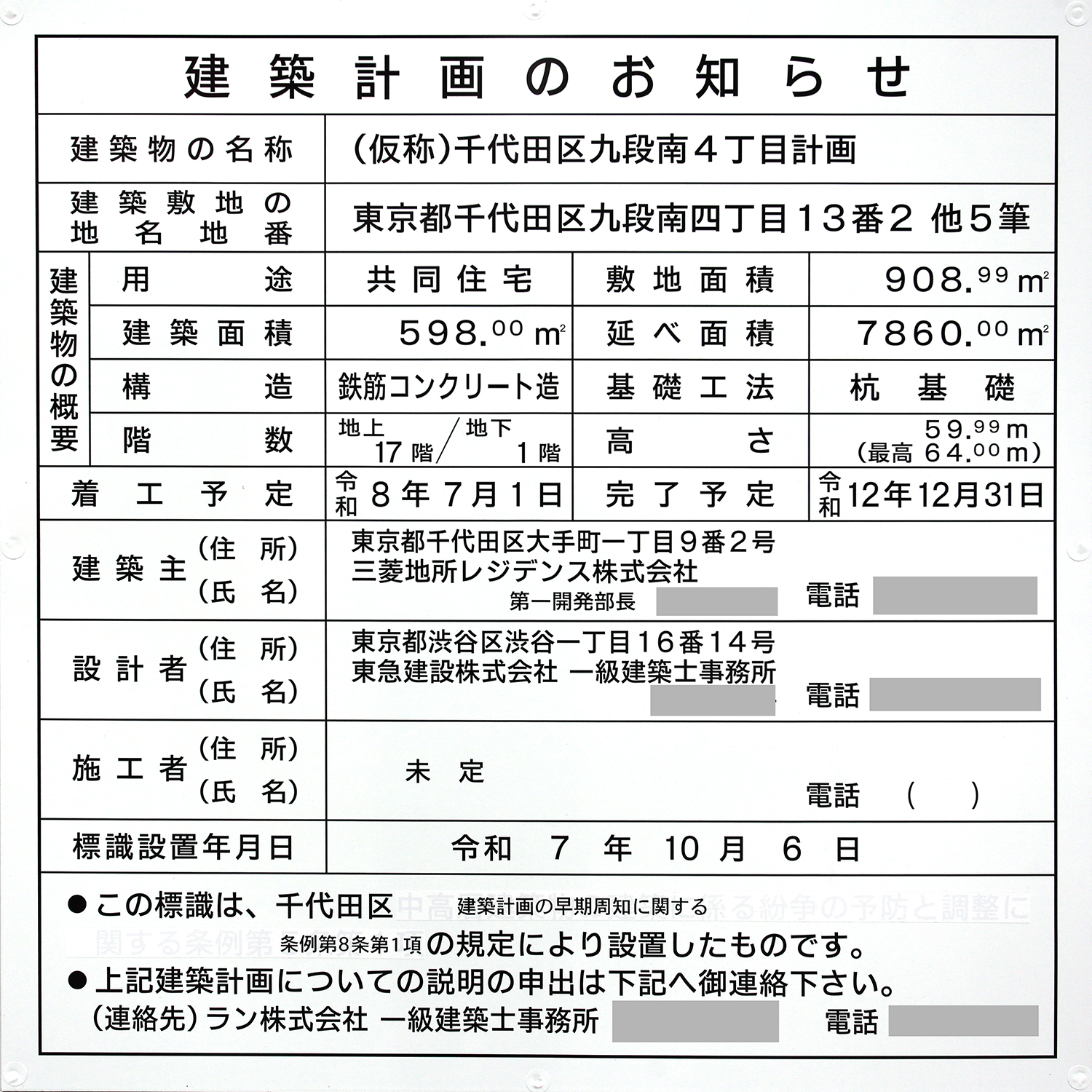 「(仮称)千代田区九段南4丁目計画」の建築計画のお知らせ。2025年10月6日に設置されています。写真クリックで拡大画像を表示。