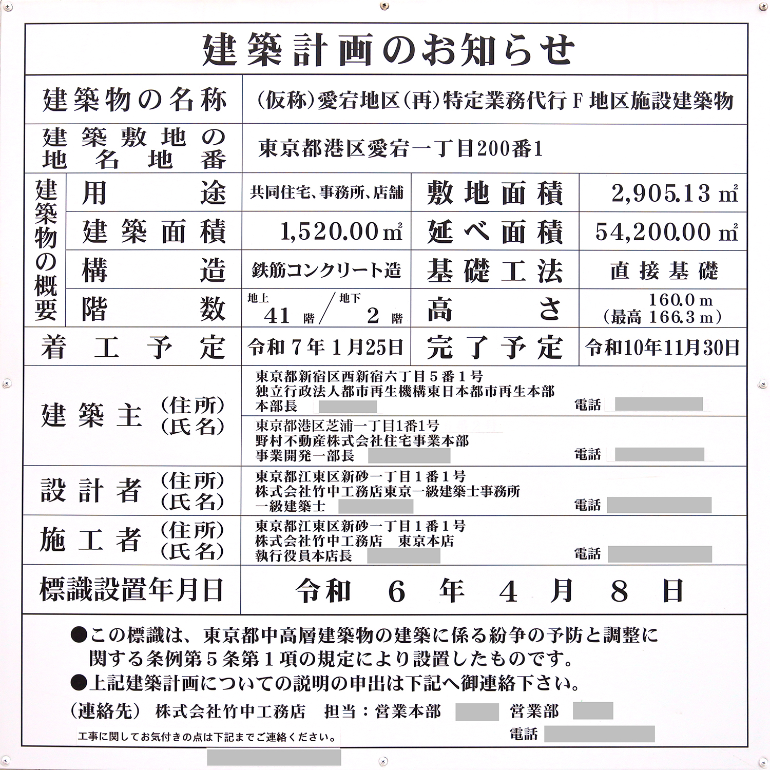 「(仮称)愛宕地区(再)特定業務代行F地区施設建築物」の建築計画のお知らせ。前回撮影時と内容は同じです。写真クリックで拡大画像を表示。