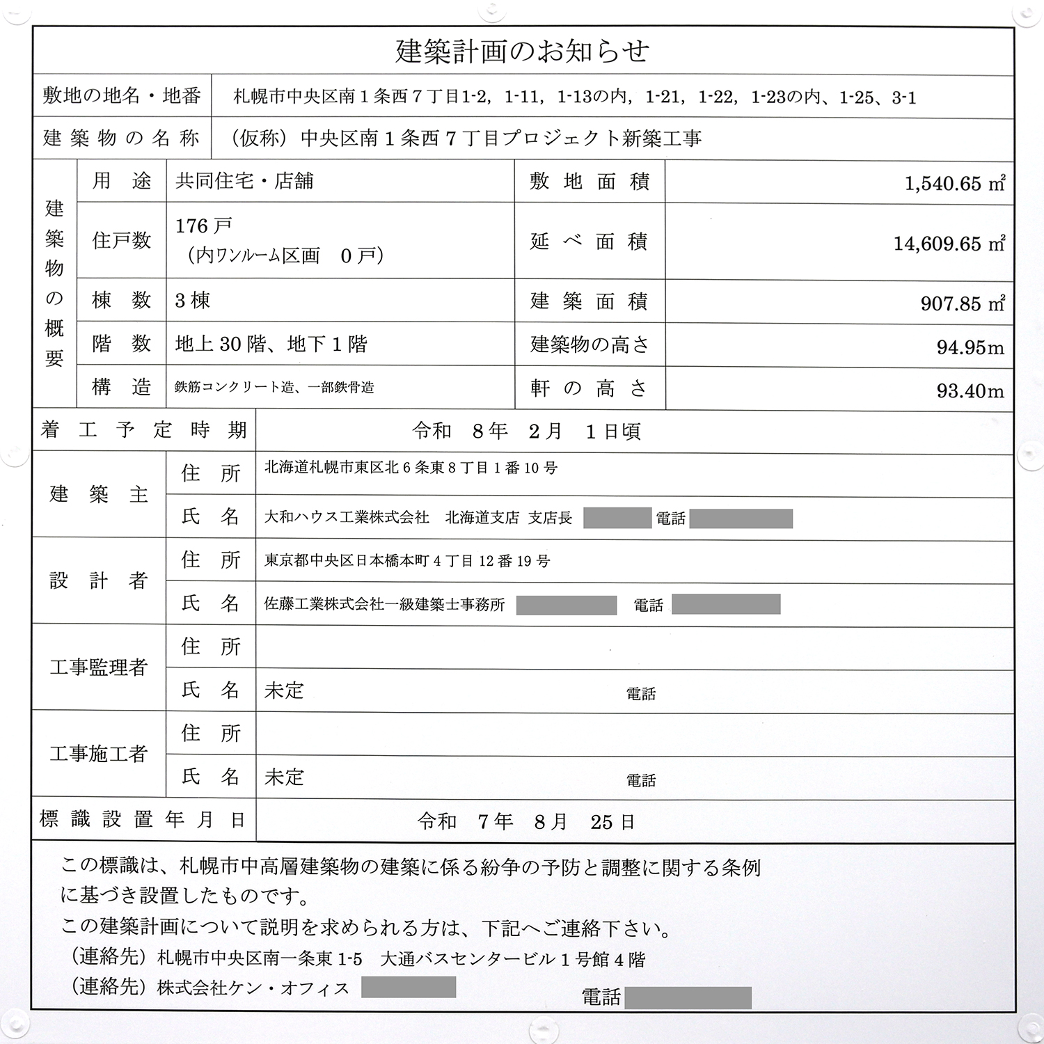 大和ハウス工業は、札幌市中央区南1条西7丁目に地上30階、地下1階、高さ94.95m、総戸数176戸の店舗併設分譲タワーマンションを新設します。 設計は佐藤工業。 2026年2月に着工し、2029年5月末に竣工する予定です。