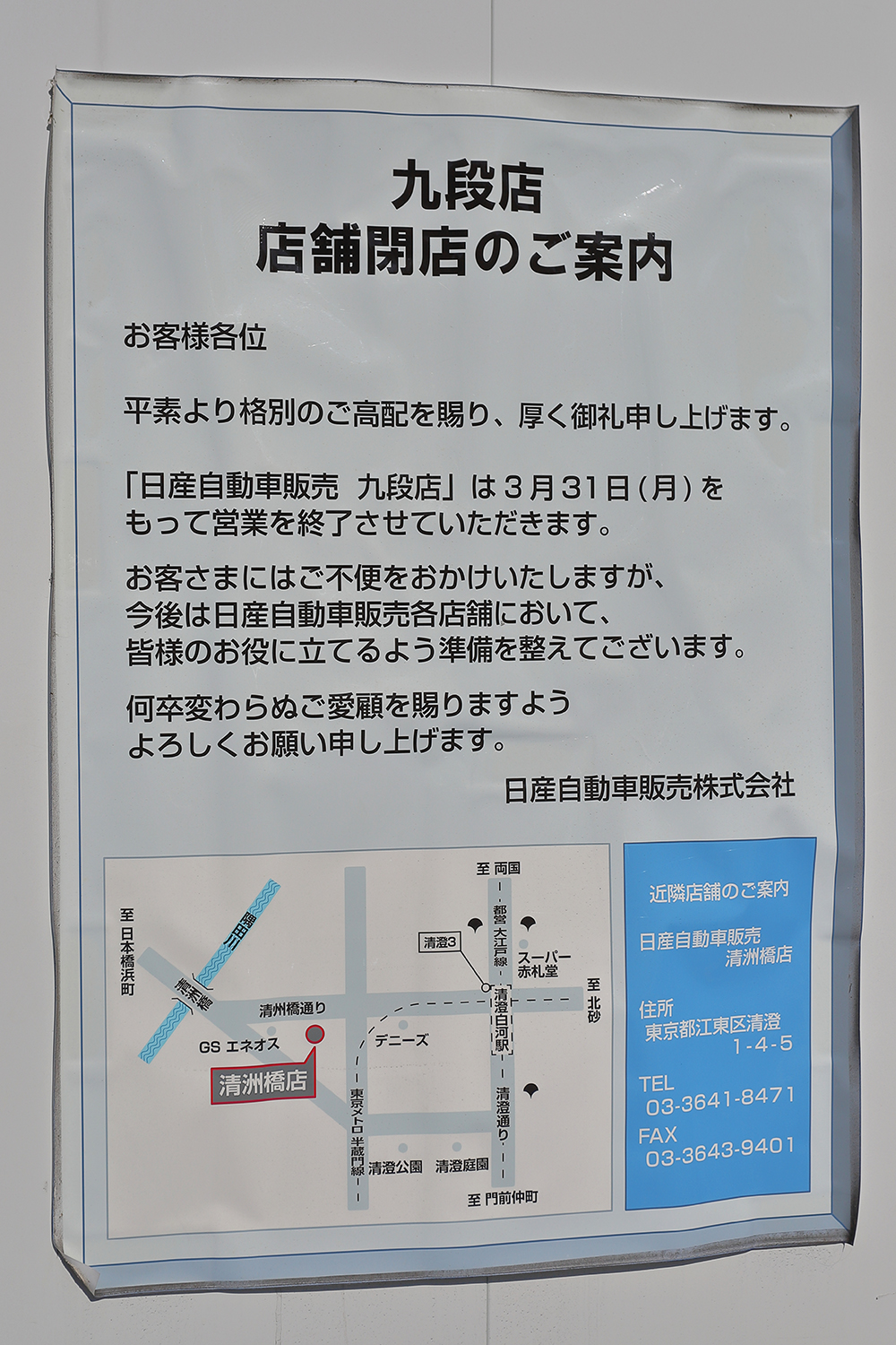 「日本臓器製薬九段ビル」の1階に入っていた「日産自動車販売 九段店」は2025年3月31日をもって閉店しています。 写真クリックで拡大画像を表示。