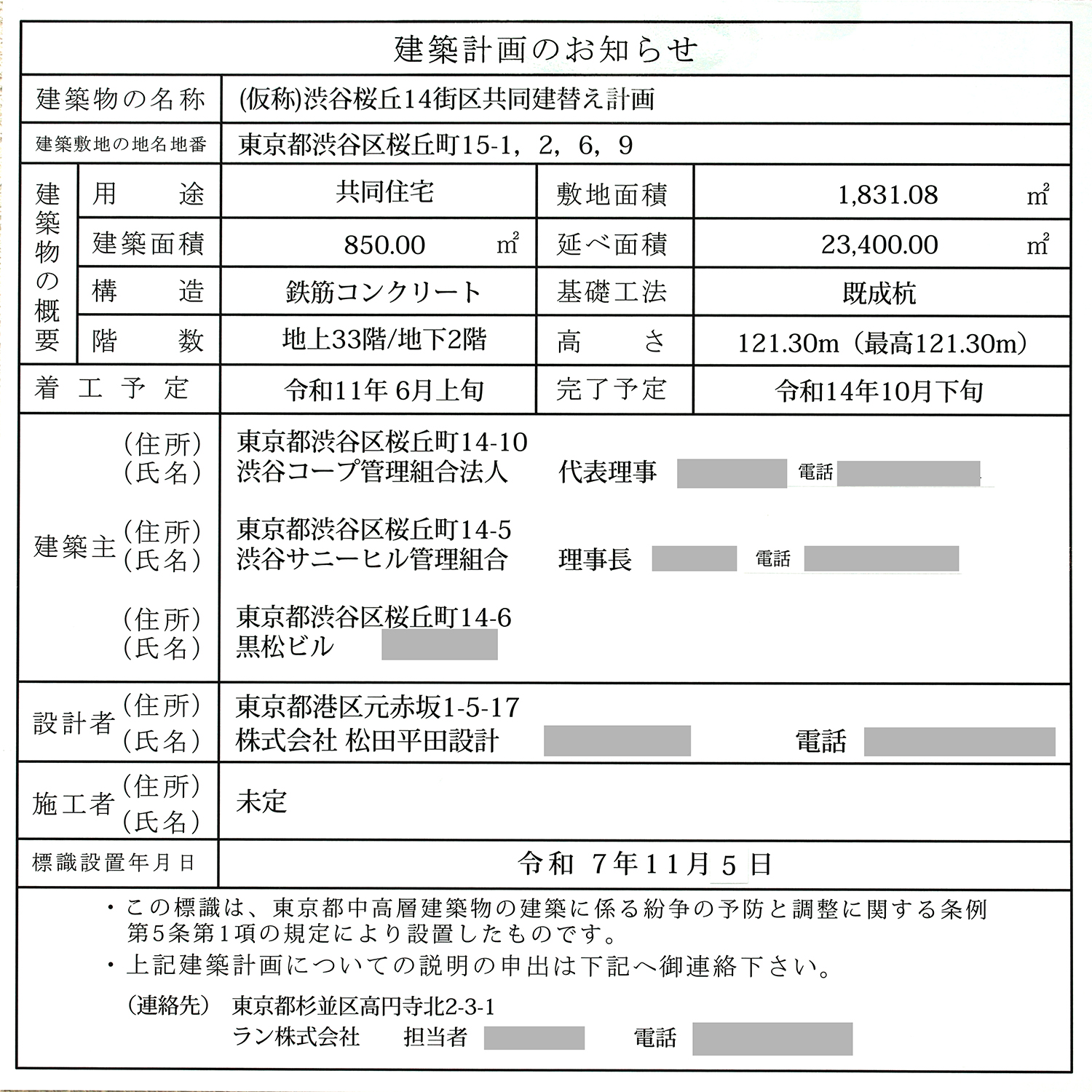 本題の「(仮称)渋谷桜丘14街区共同建替え計画」の建築計画のお知らせ。 標識設置日は2025年11月5日なので、着工の3年8か月前に設置されたことになります。 かなり早いですね。 2029年6月上旬に着工し、2032年10月下旬に竣工する予定です。