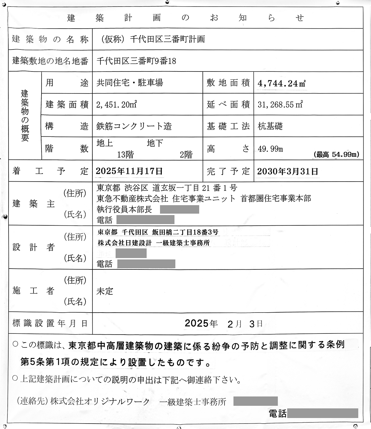「(仮称)千代田区三番町計画」の建築計画のお知らせ。 2030年3月末に竣工する予定です。 写真クリックで拡大画像を表示。