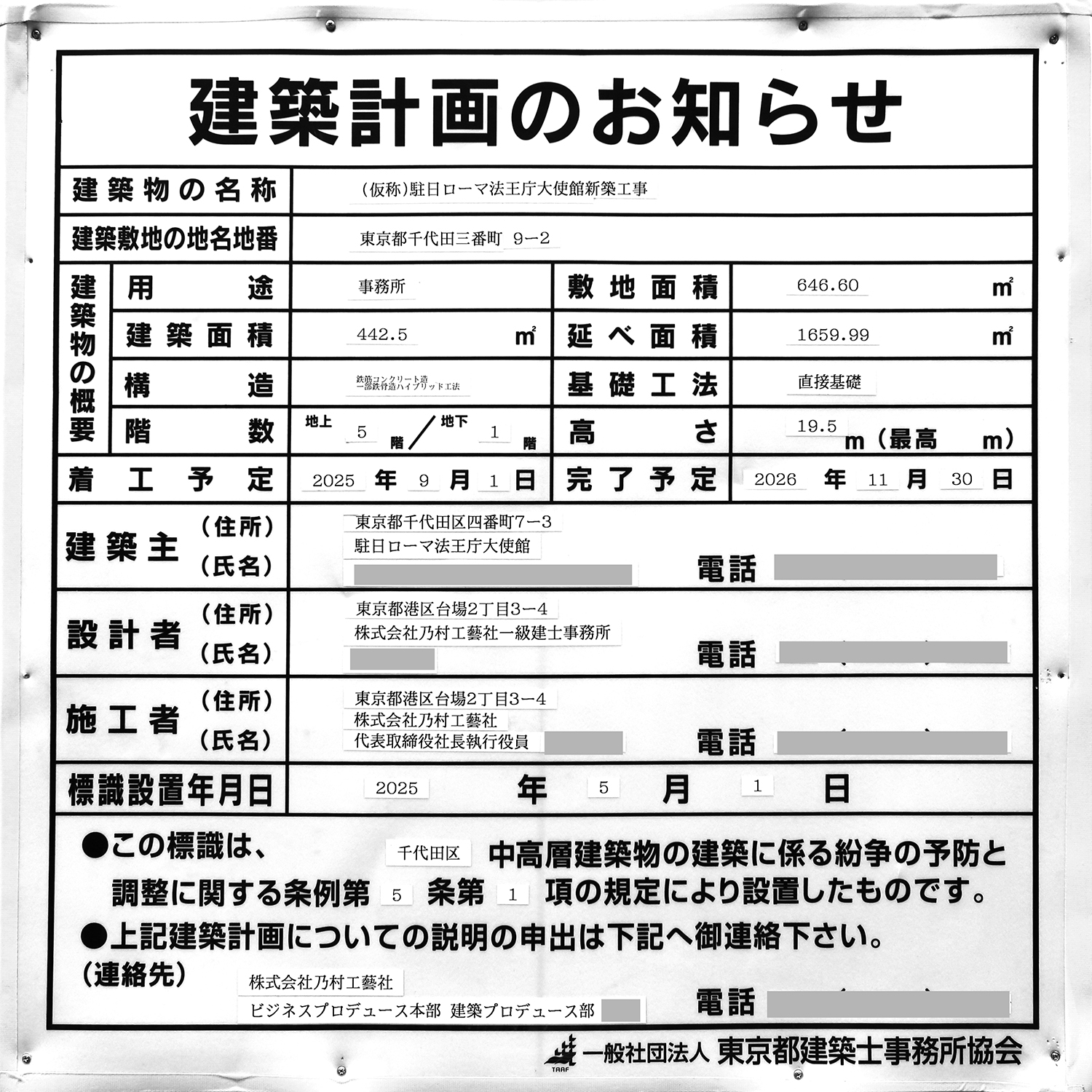 「(仮称)駐日ローマ法王庁大使館新築工事」の建築計画のお知らせ。 2026年11月末に竣工する予定です。 写真クリックで拡大画像を表示。